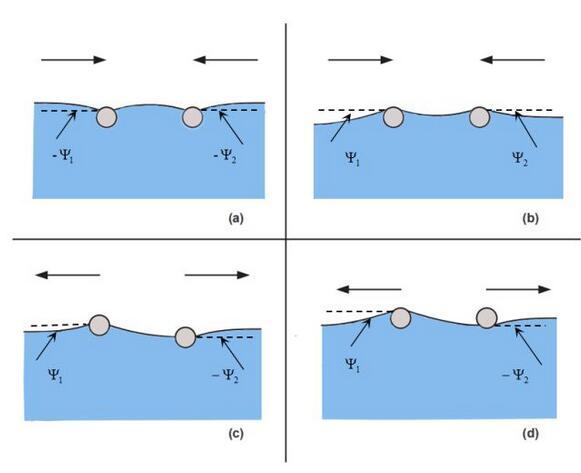 上圖便是水上兩個漂浮小球的吸引與排斥的判斷方法。值得注意的是,我們這里并沒有提及小球的浸潤性,也就是說,浸潤性與橫向毛細力的性質(zhì)并不直接相關(guān)。實際上,橫向毛細力還可以分為漂浮橫向毛細力和浸沒橫向毛細力。我們討論的情況是漂浮橫向毛細力,由小球的重力引起,題主的所說的浸潤性應(yīng)該換為小球的輕重(與水相比)。例如圖(a)里是兩個比水重的小球,表面張力將其往上拉。圖(b)是兩個比水輕的小球,表面張力將其往下拉。表面張力的方向恰好就對應(yīng)了前述接觸線處液面的傾斜角。題主的所要表達的意思其實是: