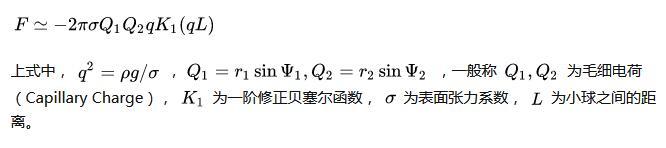 具體過程大家可以閱讀文末的參考文獻,這里直接給出在小顆粒和液面小變形下假設(shè)下,兩小球之間橫向毛細力的表達式,