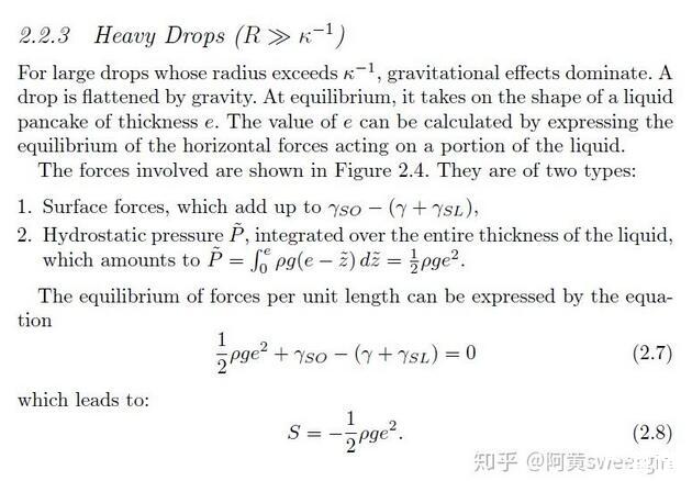 有意思的是,已經有前人對這種情形做過詳細的受力分析。得出只要接觸角一定,此時無論加多少水,液體的厚度e都不會增加,只會增加鋪展的面積。其厚度e的表達式為: