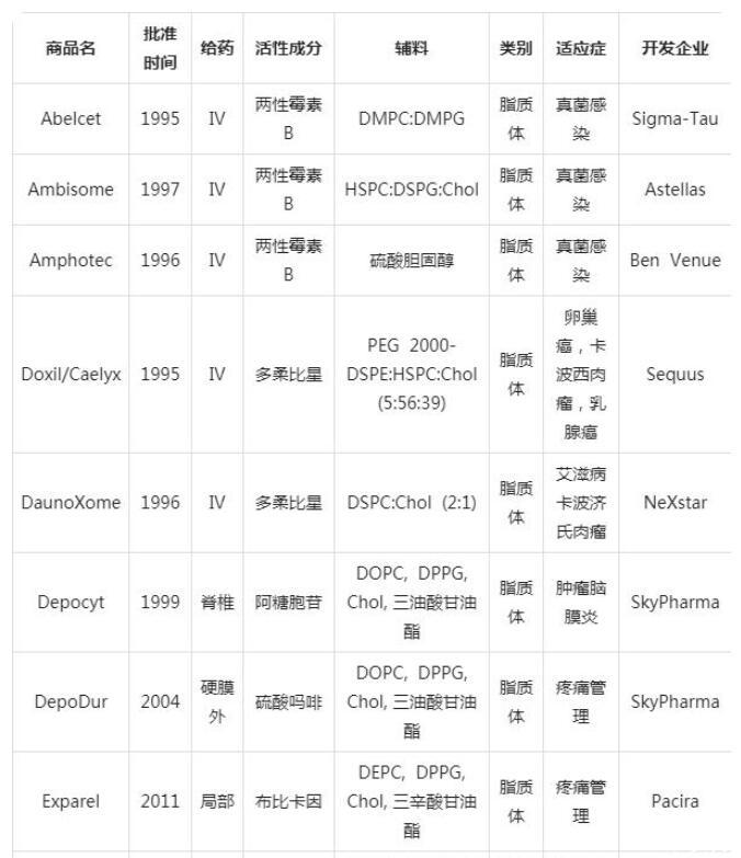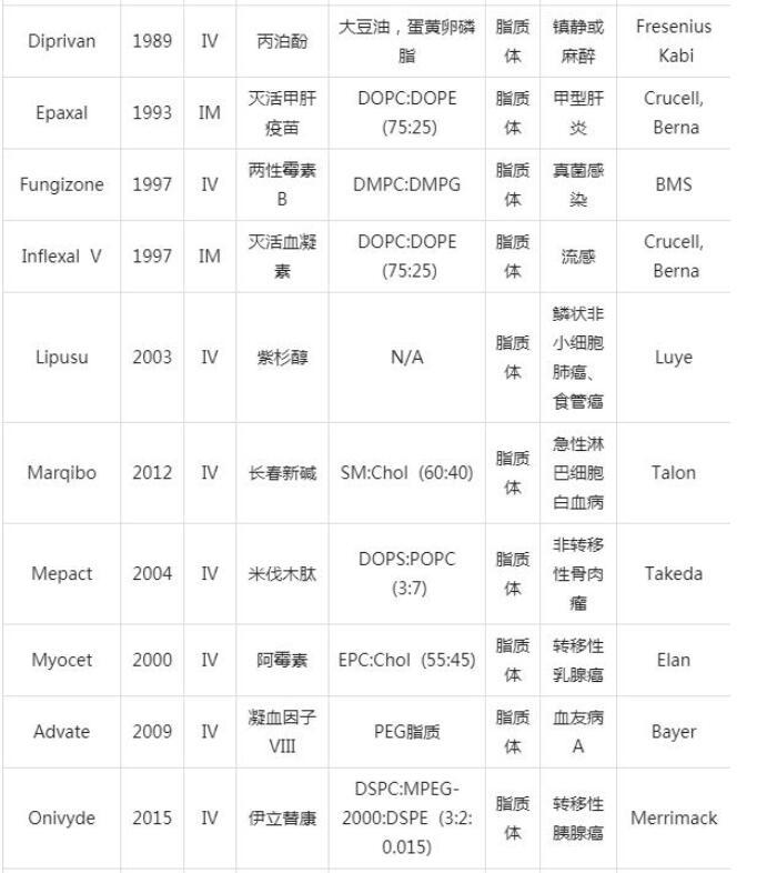 由于EPR效應,脂質納米粒在腫瘤中的蓄積使得納米顆粒在腫瘤細胞附近選擇性地釋放抗腫瘤藥物。Doxil是最早獲批的抗腫瘤納米制劑,也是最早獲批的脂質體藥物。該產品可以改善蒽環類藥物阿霉素的藥代動力學和生物分布,阿霉素是一種強效抗癌劑,但具有心臟毒性。Doxil利用EPR,使用空間穩定的納米顆粒(~100 nm)來延長藥物在血漿中的循環時間,同時降低多柔比星的心臟毒性。Doxil作為靜脈注射劑開發,由大豆磷脂酰膽堿、膽固醇和DSPE-PEG2000組成,用于治療晚期卵巢癌、多發性骨髓瘤和HIV相關的卡波西肉瘤。