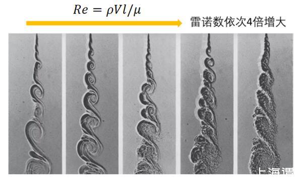 隨著雷諾實驗和雷諾數被提出來以后,近代流體力學,尤其是湍流理論的發展出現了一個前所未有的盛況,而粘性與湍流的關系也順理成章的轉化成了雷諾數和湍流的關系。1974年刊登于《流體力學》期刊中的一篇經典文章,通過流動顯示技術生動形象的描繪了雷諾數和流態的關系:隨著雷諾數的增大,渦旋的整體形狀和尺度基本一致,然而射流摻混的渦系結構卻越來越豐富。