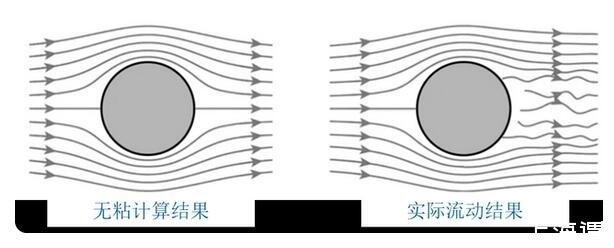 歐拉提出歐拉方程后不久,人們就認識到方程中缺乏粘性項,這會導致歐拉方程的計算結果和實際產生偏差,比如大家熟知的達朗貝爾佯謬。下圖顯示了理想流體和實際流體下圓柱繞流的對比,可以看出,無粘流動的結果和實際存在很大的差異。因此,如何在流動方程中添加粘性項成為了跨越百年的流體力學難題。