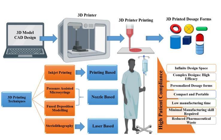 3D打印技術(shù)中不需要造粒、壓片以及包衣等環(huán)節(jié),并且可以靈活控制藥物的劑量以及釋放,所以該技術(shù)逐漸發(fā)展起來(lái)。3D打印技術(shù)主要有選擇性激光燒結(jié)(SLS)、光固化成型(SLA)、熔融沉積成型(FDM)、半固體擠出成型(SSE)以及噴墨成型打印(IJP)等方式。3D打印藥物目前的代表藥物,為FDA批準(zhǔn)的Spritam。
