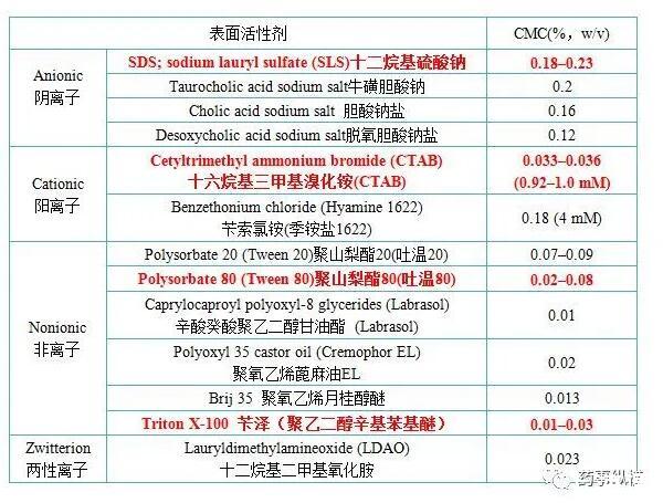 如果上述條件都不合適,可以考慮采用加入表面活性劑,此時應查詢國內外文獻、專利、質量標準,并結合藥物結構選擇表面活性劑的種類。篩選時,應根據情況考慮涵蓋所有常用種類的表面活性劑,比如陰離子型、陽離子型、和非離子型。USP中列舉了多種商品化的表面活性劑及其臨界膠束濃度(Critical Micelle Concentration,CMC)的近似臨界值,在方法開發中可以參考。