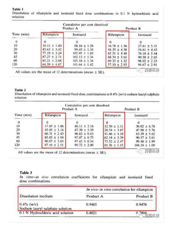 利福平與異煙肼復方制劑在進行溶出曲線測定時發現利福平在0.1N鹽酸中不穩定,發生降解。由于利福平在水中不溶,因此采用了0.4%SDS溶液進行了研究,結果表明在整個分析檢測過程中無降解。而且,0.4%SDS溶液的體內外相關性很好。