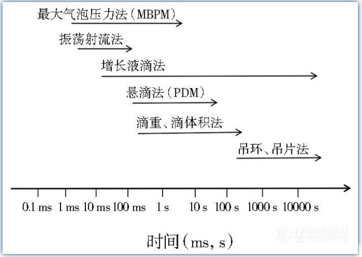 由于對DST時間范圍界定的不同,可運用的測量手段也有所不同。王建坤等認為,在達到靜態(tài)表面張力前的表面張力變化都可算是DST,這個時間范圍以幾毫秒到幾小時計。可用Wilhelmy吊片法、DuNouy吊環(huán)法、滴重法、滴體積法、懸滴法、最大氣泡壓力法測定DST。