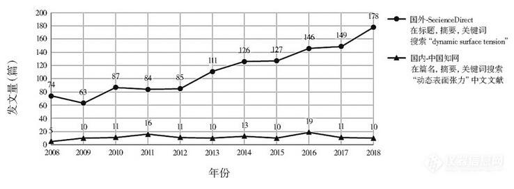 當研究的液體吸附過程在快速、持續(xù)進行,且短時間內(nèi)無法達到平衡時,對液體DST的研究比靜態(tài)表面張力更有意義。如在農(nóng)藥噴灑、噴墨印刷、織物快速潤濕,以及攝影用薄膠片制備中。圖1對比了近10年(2008~2018年)國內(nèi)外發(fā)表的以DST為主要考察項的論文數(shù)。數(shù)據(jù)顯示國內(nèi)在DST方面的研究較少且總體波動不大,而國外則呈持續(xù)上升趨勢。
