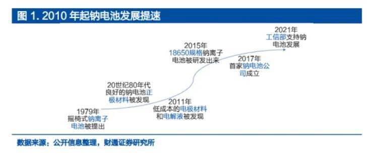 鈉電池隨著產(chǎn)業(yè)化加速,量產(chǎn)在即。1979年法國(guó)的Armand提出了“搖椅式電池”的概念,開始鈉離子電池的研究。隨后Delmas和Goodenough發(fā)現(xiàn)了層狀氧化物材料可作為鈉電池正極材料,Stevens和Dahn發(fā)現(xiàn)硬碳材料作為負(fù)極有良好的鈉離子嵌脫性能。2010年以來,鈉電池的研發(fā)進(jìn)程加速。2011年中科院物理所研究員團(tuán)隊(duì)開始了鈉離子電池核心技術(shù)的研發(fā),自此以后開發(fā)出低成本的電極材料。2017年國(guó)內(nèi)第一家專注于鈉離子電池研發(fā)和生產(chǎn)的公司中科海鈉成立。2021年寧德時(shí)代成功舉行了第一代鈉離子電池線上發(fā)布會(huì)。2022年,中科海納和傳藝科技均預(yù)計(jì)2023年量產(chǎn)其鈉離子電池。