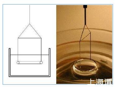 掛環法(Du Nouy Ring method):這可能是測量表面/界面張力的最經典方法,文獻上報道的許多液體的表/界面張力值是用這一方法測得,它甚至可以在很難浸濕的情況下被使用。用一個初始浸在液體的環從液體中拉出一個液體膜(類似肥皂泡),同時測量提高環的高度時所需要施加的力。