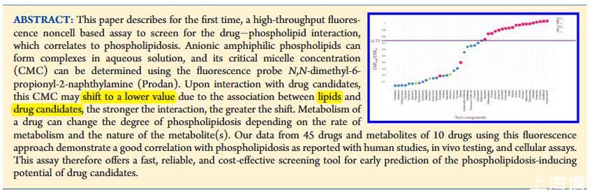 本文首次描述了一種與磷脂質(zhì)相關(guān)的高通量熒光。陰離子兩親磷脂可以在水溶液中形成復(fù)合物,其臨界膠束濃度(CMC)可以使用熒光探針N,N-二甲基-6-丙酰-2-萘胺(Prodan)測(cè)定。在與候選藥物相互作用時(shí),由于脂質(zhì)和候選藥物之間的關(guān)聯(lián),該CMC可能會(huì)轉(zhuǎn)變?yōu)檩^低的值,相互作用越強(qiáng),轉(zhuǎn)變?cè)酱蟆K幬锏拇x可以根據(jù)代謝速率和代謝物的性質(zhì)改變磷脂質(zhì)的程度。我們使用這種熒光方法從45種藥物和10種藥物的代謝物獲得的數(shù)據(jù)證明了與人體研究、體內(nèi)測(cè)試和細(xì)胞分析報(bào)告的磷脂沉積癥有良好的相關(guān)性。因此,該測(cè)定提供了一種快速、可靠且具有成本效益的篩選工具,用于早期預(yù)測(cè)候選藥物的磷脂沉積誘導(dǎo)潛力。
