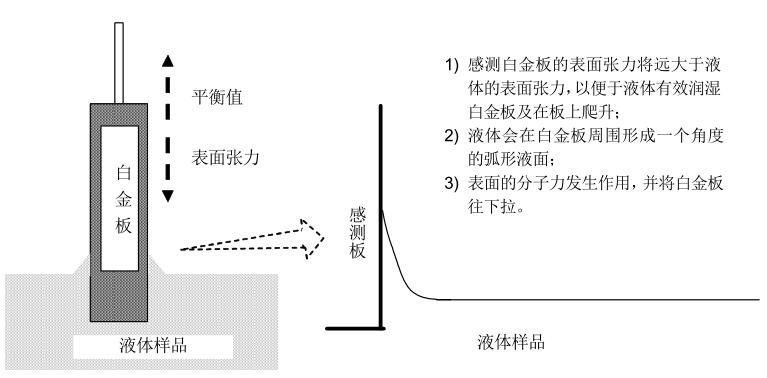 當感測白金板浸入到被測液體后,白金板周圍就會受到表面張力的作用,液體的表面張力會將白金板盡量地往下拉。當液體表面張力及其他相關的力與平衡力達到均衡時,感測白金板就會停止向液體內(nèi)部浸入。這時候,儀器的平衡感應器就會測量浸入深度,并將它轉(zhuǎn)化為液體的表面張力值。