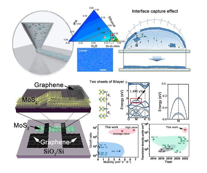 二維(2D)半導體材料為將摩爾定律擴展到原子尺度提供了機會。與傳統(tǒng)基于蒸鍍和光刻技術(shù)的加工技術(shù)相比,印刷電子因成本效益、靈活性以及與不同襯底的兼容性而受到關(guān)注。目前,印刷的二維晶體管受到性能不理想、半導體層較厚和器件密度低的制約。同時,多數(shù)二維材料油墨通常使用高沸點溶劑,隨之而來的問題包括器件性能退化、高材料成本和毒害性等,難以大規(guī)模應(yīng)用。因此,發(fā)展簡單且環(huán)保的策略對于制造低成本、大規(guī)模的打印二維材料功能器件具有重要意義。