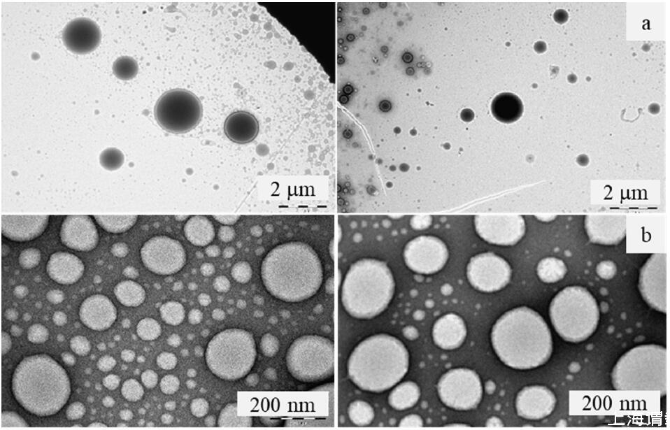 為了進一步證實這些大聚集體的形態,SCAG、SCAA、SCAS和SCOS水溶液的TEM顯微照片如圖3所示。SCAG和SCAA水溶液中形成球狀囊泡,而SCAS和SCOS自聚集成管狀囊泡。對于SCAG和SCAA,觀察到的球形囊泡的直徑分別約為1μm和100-200 nm,與DLS測量結果一致。SCAS和SCOS的小管長度L≤4μm,直徑d≤40 nm和100 nm。這些與DLS結果一致,表明由SCOS形成的聚集體的等效流體動力學直徑大于來自SCAS的聚集體。TEM結果表明聚集體的形態取決于氨基酸殘基和疏水尾部的結構。對于源自蓖麻油的表面活性劑,疏水尾部的-OH基團促進了球形囊泡的形成;而對于絲氨酸頭基上帶有-OH基團的表面活性劑,小管更穩定。