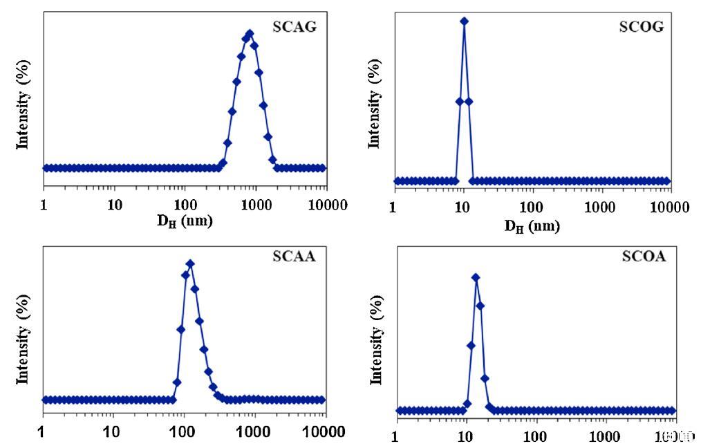 用DLS測量在6種酰基氨基酸表面活性劑水溶液中形成的聚集體的大小和分布,其CMC為5倍,5×CMC。圖2顯示了它們的表觀等效流體動力學直徑(DH)。除絲氨酸外,蓖麻油表面活性劑的DH分布普遍大于棉籽油表面活性劑的DH分布。SCAG和SCAA的DH分布分別集中在900和150 nm,而SCOG和SCOA聚集體的直徑約為10 nm。對于絲氨酸,SCAS和SCOS的平均DH值分別約為100 nm和250 nm。這些結果可以通過蓖麻油衍生的表面活性劑的蓖麻油基和絲氨酸頭部基團上都存在-OH基團來解釋,促進了大聚集體,例如囊泡的形成(圖2)。