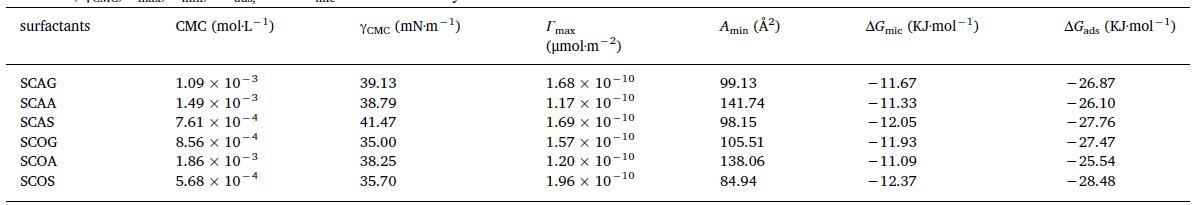 表格1 6種酰基氨基酸表面活性劑在25℃下的CMC、γCMC、Γmax、Amin、ΔGads和ΔGmic值。
