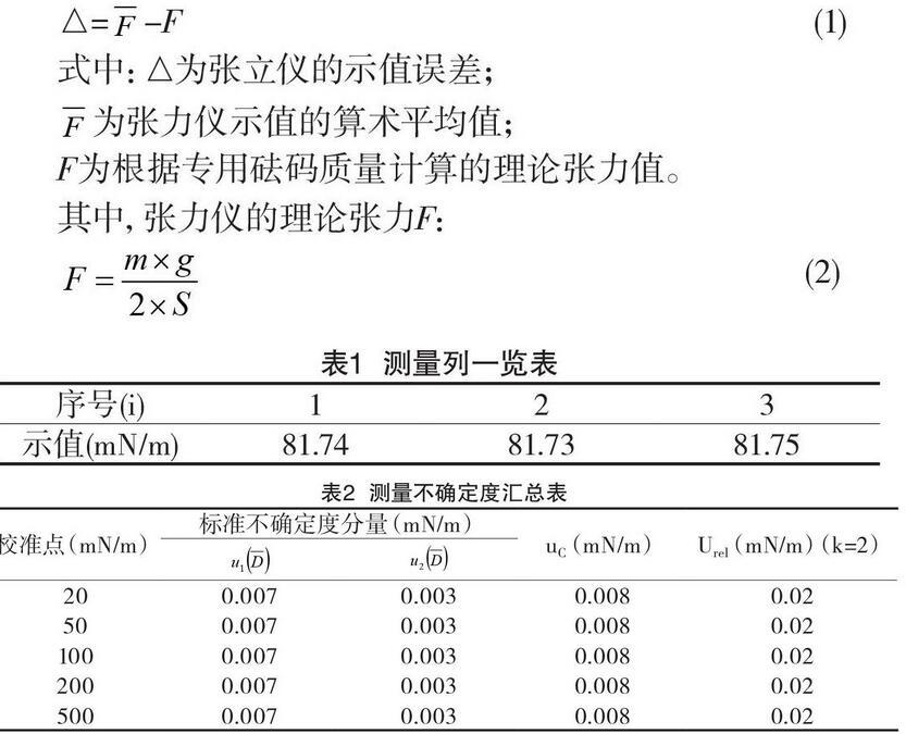界面張力儀是采用圓環法在非平衡的條件下,測量各種液體表面張力及礦物油與水的界面張力,能可靠的指示出親水氧化物的存在情況。對界面張力儀的校準研究院用專用砝碼(最大秤量:1000g,MPE:±0.1%)直接測量張力儀,測量3次,其3次測量的算術平均值與理論值之差即為張力儀張力值的示值誤差[4,5]。