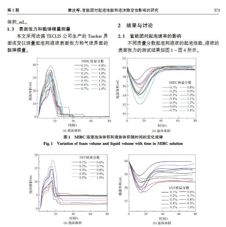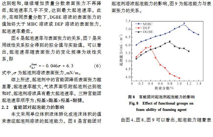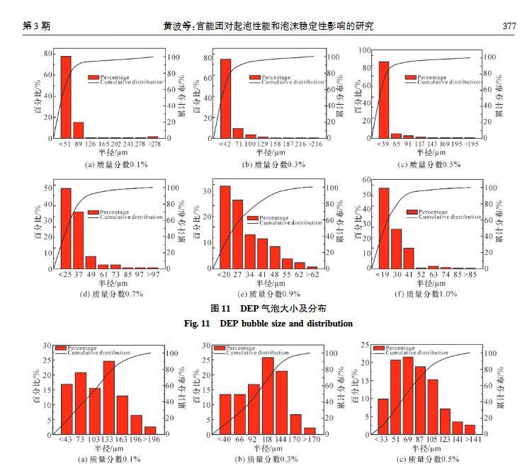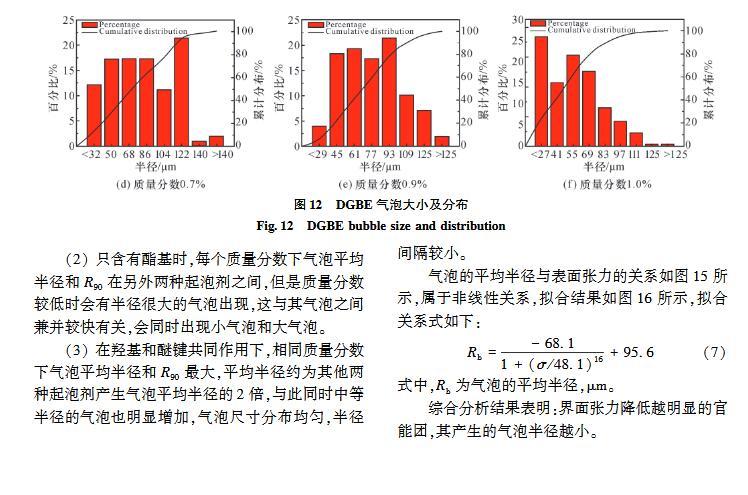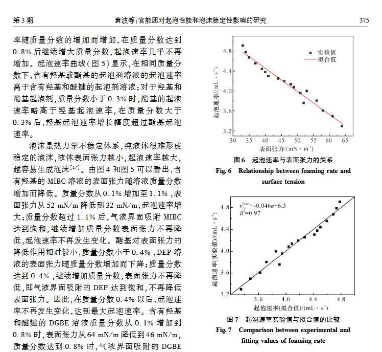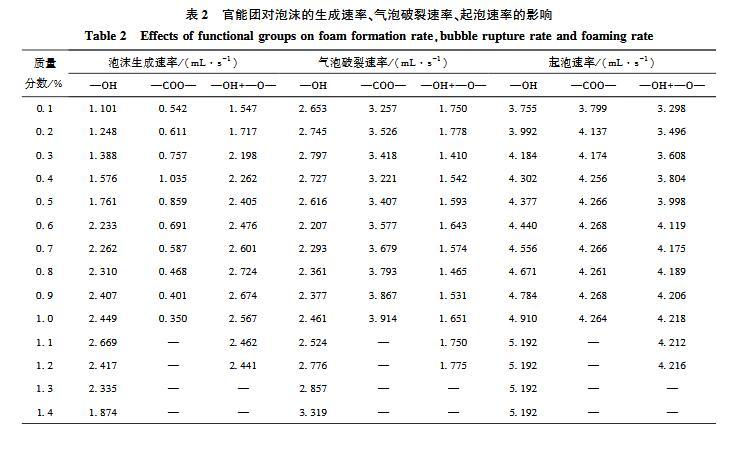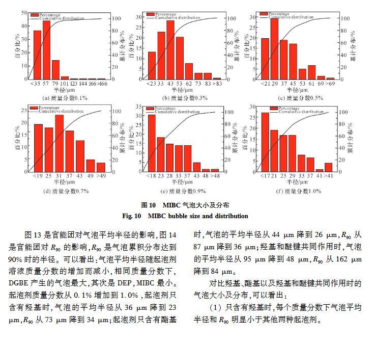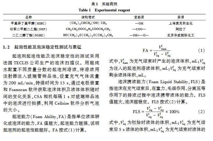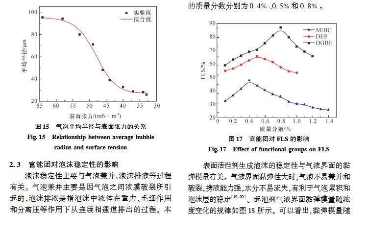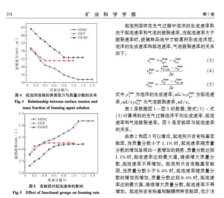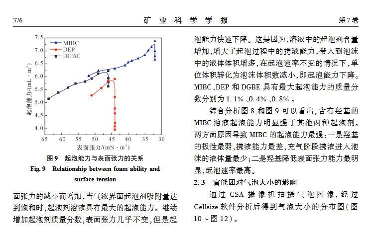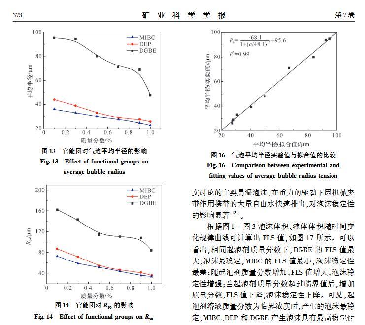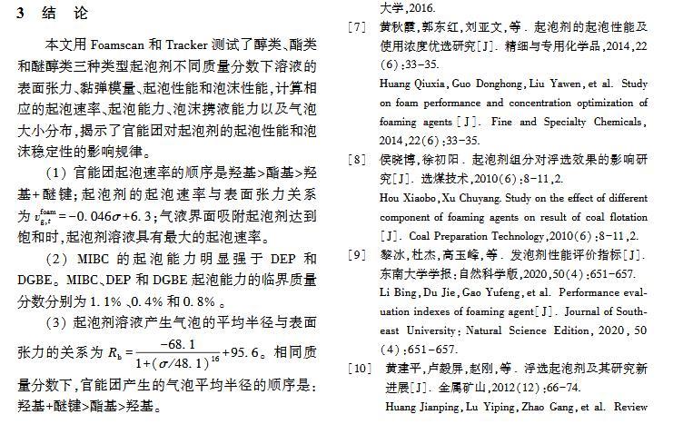 【摘要】:浮選是分離微細物料的重要方法,起泡劑類型和泡沫穩定性顯著影響浮選效果。本文選取醇類(MIBC)、酯類(DEP)和醚醇類(DGBE)三種起泡劑,通過實驗研究官能團對起泡性能和泡沫穩定性的影響。實驗用Foamscan測定起泡劑溶液的起泡性能和泡沫穩定性,用Tracker流變儀測定表面張力和氣液界面黏彈模量。研究結果表明:起泡速率隨表面張力的減小呈線性增大,當氣液界面吸附起泡劑達到飽和時起泡速率最大,其中MIBC的起泡速率最高,DGBE最小;起泡劑濃度為臨界質量分數時,起泡能力最大,MIBC、DEP和DGBE的臨界質量分數分別為1.1%、0.4%和0.8%;氣泡的大小隨溶液表面張力減小而減小,氣泡平均尺寸由大至小順序為:DGBEDEPMIBC;在泡沫穩定性方面,醚醇類起泡劑最強,醇類起泡劑最差,同時MIBC、DEP和DGBE質量分數分別為0.4%、0.5%和0.8%時,起泡劑生成的泡沫最穩定。