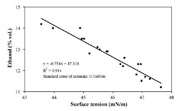 如統(tǒng)計分析所示,乙醇、單寧和蛋白質(zhì)是與表面張力最相關的三個參數(shù)。 一方面考慮到它們在釀酒學上的重要性,另一方面考慮到它們的測定方法費力,我們使用回歸分析研究了各種數(shù)學模型,目的是通過簡單的表面測量獲得評估其濃度水平的預測模型。緊張。 正如預期的那樣,最適合的模型用于估計乙醇含量。 描述它的散點圖和線性方程如圖 2 所示。該模型將乙醇濃度的變化解釋為 91.4%,估計的標準誤差等于 0.3 mN/m。