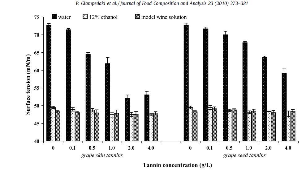 為了突出葡萄酒主要成分對表面張力的影響,制備了乙醇、蛋白質(zhì)和單寧標準溶液,并在三種不同的基質(zhì)中測定了它們的表面張力:水、水/乙醇混合物(12%,v/v 乙醇)和模型葡萄酒溶液(12%,v/v 乙醇,2 g/L 酒石酸,pH 3.5)。 研究的濃度在通常在葡萄酒中發(fā)現(xiàn)的范圍內(nèi)。 選擇 BSA 作為參考蛋白質(zhì),代表表面活性蛋白質(zhì)。 眾所周知,BSA 具有與廣泛使用的表面活性劑十二烷基硫酸鈉 (SDS) 相當?shù)膬?yōu)異發(fā)泡性能(Razafindralambo 等,1996)。 結(jié)果如表 1 所示。使用市售的釀酒單寧(從葡萄皮和種子中提取的單寧的天然混合物),因為它們被認為是葡萄酒中天然存在的單寧的代表。 結(jié)果如圖1所示。