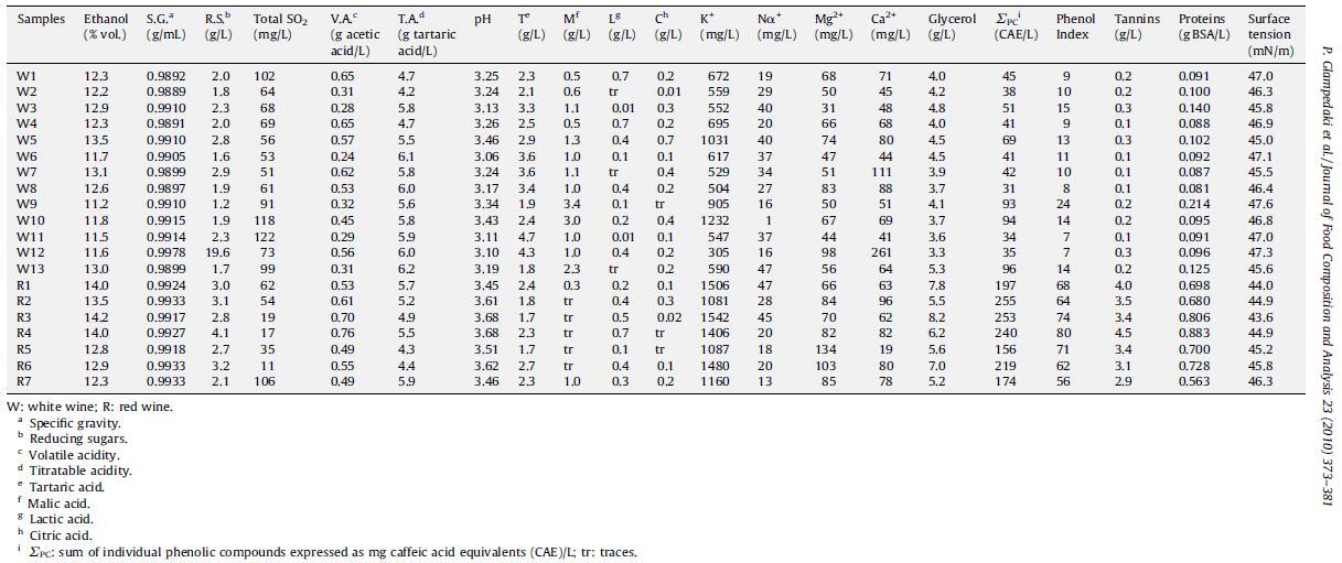 為此,對 20 種靜止、白色和紅色希臘單品種葡萄酒樣品進行了常規(guī)釀酒學參數(shù)(乙醇含量、比重、還原糖、可滴定酸度、揮發(fā)性酸度、總 SO2 和 pH 值)和表面張力的測定。 還進行了使用 HPLC 測定有機酸(酒石酸、蘋果酸、乳酸和檸檬酸)、陽離子(鉀、鈉、鎂和鈣)、甘油和酚類化合物以及使用氣相色譜法測定揮發(fā)性化合物的基本儀器分析。 最后,采用光譜法進行總酚指數(shù)、單寧和蛋白質(zhì)測定。 結(jié)果如表 2 和表 3 所示。關于蛋白質(zhì)測定,可能影響所有樣品的系統(tǒng)分析誤差可視為不影響最終值,因為所研究的葡萄酒具有相似的乙醇含量。 此外,在葡萄酒樣品中加入已知量的標準 BSA 溶液進行的分析未發(fā)現(xiàn)對蛋白質(zhì)測定有任何干擾(數(shù)據(jù)未顯示)。 上述數(shù)據(jù)與表面張力的相關性分析結(jié)果如表4所示。