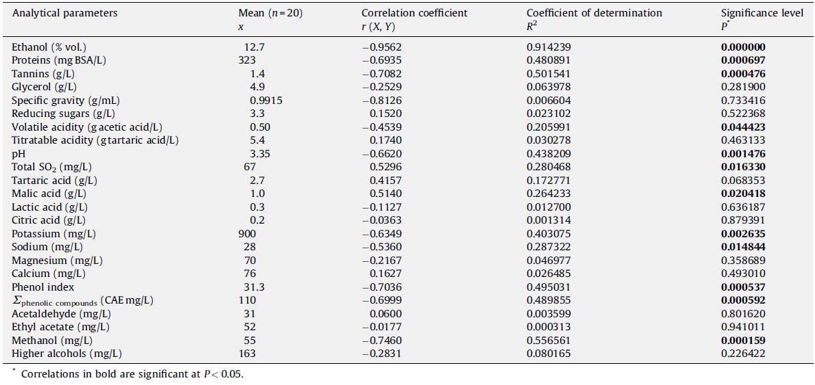 統(tǒng)計分析顯示,在檢查的 24 個分析參數(shù)中,有 12 個與表面張力顯著相關(P < 0.05)(表 4)。 其中有 10 個(乙醇、蛋白質(zhì)、單寧、揮發(fā)性酸度、pH、鉀、鈉、甲醇和總酚——280 nm 吸光度和 HPLC 測定)具有負相關系數(shù),表明它們與表面張力成反比,較高的它們的值,樣品的表面張力越低。 另外兩個(蘋果酸和總 SO2)具有正相關系數(shù)。 測量的最小 P 值 (P = 0.000000) 對應于乙醇,第二小 (P = 0.000476) 對應于單寧,表明這兩個參數(shù)與表面張力的相關性最好。 不出所料,還原糖和比重根本沒有關聯(lián),因為糖分子表現(xiàn)出高水溶性并且?guī)缀鯖]有表面活性。