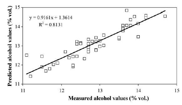 為了測試乙醇預測模型,我們分析了第二組 30 個葡萄酒樣品。 所提出的線性模型預測的值與葡萄酒酒精度等級的測量值的圖如圖 3 所示。更新的模型解釋了 81.3% 的乙醇含量變化,而現(xiàn)在估計的標準誤差為 0.36 % (v/v)。 盡管必須進一步優(yōu)化,但該統(tǒng)計工具為文獻中現(xiàn)有的那些提供了一種額外的方法,用于簡單快速地估計靜止葡萄酒的酒精等級(Rocchia 等,2007a,b)。