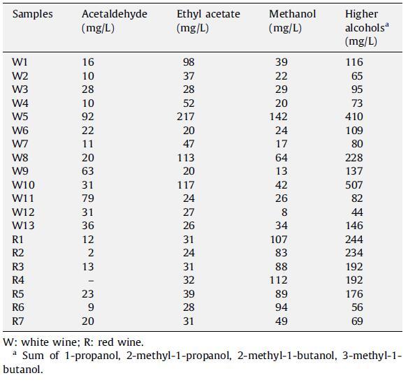 表 3 在 20 個葡萄酒樣品中測定的揮發(fā)性化合物濃度的平均值。