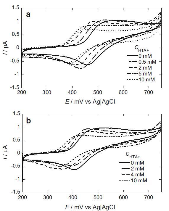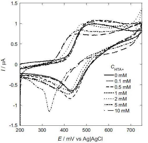 我們還研究了 HTA+ 陽離子的影響(圖 6)。 來自界面張力測量的 HTA+ 離子的 cmc 與圖 6 標(biāo)題中所述的 CV 測量溶液相同,為 3.95 mM。 I2/I? 的陽極和陰極峰均高于不存在 HTA+ 時的峰。 陽極和陰極峰值電流的增加是由于被捕獲的 I? 和 I2 從 hp-β-CD 釋放到主體中,這是由 hp-β-CD 腔中的 I? 和 I2 置換引起的與 HTA+。 另一方面,隨著 HTA+ 的濃度增加到 cmc 以上,陽極和陰極峰值電流都變得低于預(yù)膠束濃度下的峰值電流。 在 I2 和 I- 鍵合到膠束經(jīng)歷電子轉(zhuǎn)移之前,膠束必須轉(zhuǎn)向,使 I2 和 I- 面向電極表面。 它導(dǎo)致峰值電流的降低。 此外,陽極和陰極峰值電位都向負(fù)方向移動。 這表明溶解在 HTA+ 膠束中的 I2 比鍵合到 HTA+ 膠束表面的 I- 更穩(wěn)定。 隨著 HTA+ 濃度增加到 5 mM,在 330 mV 處觀察到一個尖銳的吸附減少峰。 已知在不存在任何表面活性劑的情況下,在鉑電極表面形成的 I2 會吸附在電極表面 [19]。 在我們的系統(tǒng)中,HTA+ 在低 HTA+ 濃度下抑制了 I2 的吸附。 然而,隨著HTA+濃度的增加,形成了HTA+單層,導(dǎo)致電極表面HTA+單層中的I2被吸收。 隨著 HTA+ 濃度增加至 10 mM,吸附還原峰消失。 在這個濃度下,在電極表面形成的 I2 溶解到 HTA+ 膠束中。 因此,沒有觀察到吸附峰。