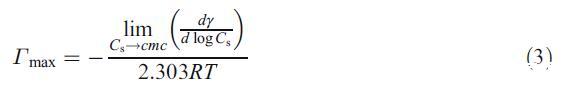 NP 溶液在不同 hp-β-CD 濃度下的界面張力(γ)如圖 1 所示。在任何 hp-β-CD 濃度下,界面張力隨著 NP 的增加而降低。 Hp-β-CD 由七個葡萄糖單元組成,形成一個具有親水外表面和疏水內(nèi)腔的環(huán),眾所周知,它主要以 1:1 的化學(xué)計量將客體分子結(jié)合到疏水腔中 [11]。 在 hp-β-CD 的水溶液中,NP 被認(rèn)為結(jié)合了 hp-β-CD 的疏水腔。 眾所周知,Hp-β-CD 由于其親水性外表面而不吸附在空氣-溶液界面。 這表明未摻入 hp-β-CD 腔的 NP 分子吸附在空氣 - 溶液界面。 在任何 hp-β-CD 濃度下均未觀察到表明膠束化開始的斷點(即臨界膠束濃度 (cmc))。 由于 NP 非常疏水,體相中的 NP 單體濃度不能增加到 cmc。 根據(jù) γ 與 log CS,非離子 NP 的最大表面過量 (Γmax) 通過 Gibb 吸附方程估計如下 [12]: