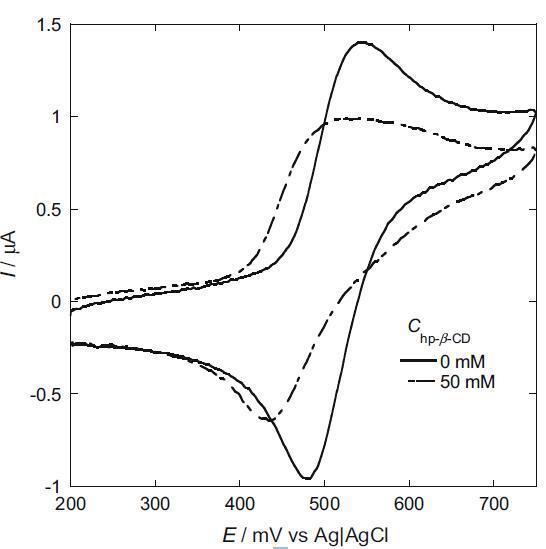 在這里,我們選擇 I2/I? 作為電化學(xué)探針,因為 I? 的電荷有望使其與陽離子膠束的結(jié)合變得容易,并且電中性 I2 有望在膠束中表面活性劑的疏水部分之間增溶并溶解在電極表面的表面活性劑單層中。 我們研究了 hp-β-CD 對 I2/I- 氧化還原峰的影響(圖 5)。 在沒有 hp-β-CD 的情況下,觀察到 I- 在約 530 mV 處的陽極峰和 I2 在約 480 mV 處的陰極峰。 在 50 mM hp-β-CD 存在下,陽極和陰極峰值電流均降低,并且它們的峰值電位向負(fù)方向移動。 陽極峰值電流的降低是由 I? 與 hp-β-CD 的親水表面結(jié)合引起的。 另一方面,陰極峰值電流的降低是由 hp-β-CD 疏水腔中包含 I2 引起的 [18]。 峰值電位的負(fù)移表明結(jié)合在 hp-β-CD 腔中的 I2 比結(jié)合到 hp-β-CD 表面的 I- 更穩(wěn)定。