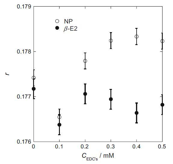 RB 分子在膠束表面區(qū)域溶解得越硬,r 值越大[15]。 r 值的變化如圖 3 所示。在 0.1 mM 時,r 值下降。 這表明 EDCs 開始溶解到膠束中擾亂了 RB 分子在膠束表面的緊密堆積。 隨著NP濃度的增加,r值增加。 然而,隨著β-E2濃度的增加,r值一度恢復(fù)并似乎一點點下降。 這表明 NP 的增溶使膠束表面更加剛性,而 β-E2 的增溶則沒有。 NP在結(jié)構(gòu)上更類似于HTA+。 因此,NP在膠束中的HTA+離子頭之間增溶,降低了膠束表面離子頭的靜電斥力,使膠束更加穩(wěn)定和剛性[16]。 另一方面,β-E2 似乎會干擾 HTA+ 的取向并降低膠束表面的剛度。