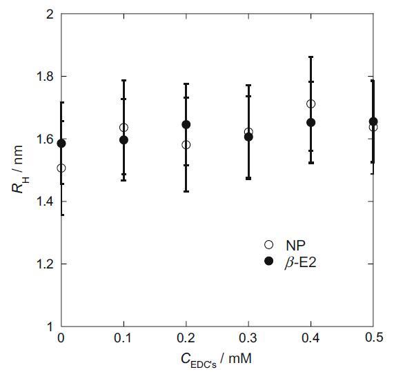 我們在每個 EDC 存在下通過動態(tài)光散射方法研究了 HTA+ 膠束的 RH(圖 4)[17]。 隨著 EDCs 濃度的增加,膠束的流體動力學(xué)半徑似乎逐漸增加。