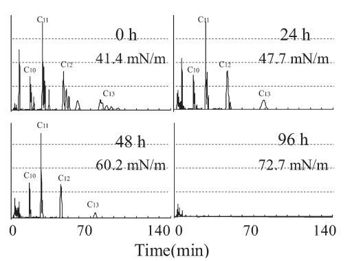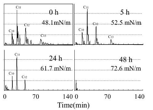 圖 11 馴化測試期間重新添加后 10 mg/L LAS 的色譜圖。 描述了重新添加后的時間和當時的表面張力。