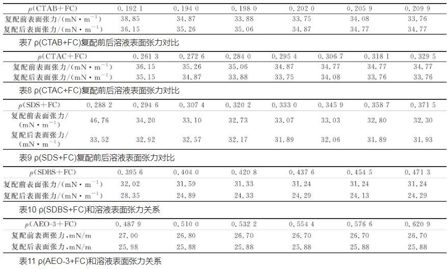 為了更好地提高表面活性劑的性能,降低表面活性劑的應(yīng)用成本,減輕其對環(huán)境的危害。在室溫下,分別測試不同濃度的碳氫表面活性劑與FC復配后表面張力的變化,實驗結(jié)果見表7~11。