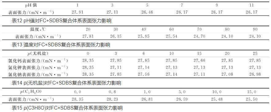 依據(jù)實驗Hz實驗結(jié)果,按照SDBS的0.395 6 g/L與0.056 0 g/L的FC復配,分別測試pH值、溫度、無機鹽和溶劑對復配體系表面張力的影響,結(jié)果見表12~15。