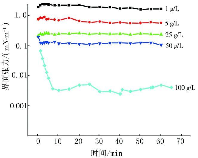 (1)通過(guò)測(cè)量不同礦化度下的陰離子-非離子表面活性劑9AS-3-0與樁西原油之間的界面張力,發(fā)現(xiàn)單純表面活性劑的動(dòng)態(tài)界面張力平衡值與動(dòng)態(tài)界面張力最低值基本相同。