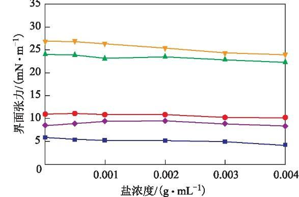 由于380號燃料油及其四組分中酸性基團占優勢,在強堿性條件下它們的油水界面張力大幅下降。鹽濃度對380號燃料油及其四組分的界面活性影響不大。