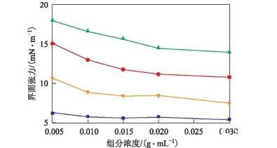 圖1 380號燃料油中四組分的油水界面張力曲線飽和分;▲—芳香分;●—膠質;■—瀝青質