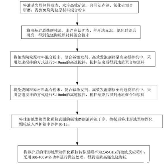 本發(fā)明一種油基巖屑-高鈦礦渣-赤泥基輕質(zhì)高強(qiáng)免燒陶粒及其制備方法,本發(fā)明使用油基巖屑熱解殘?jiān)⑺愀哜伒V渣、拜爾法赤泥作為免燒陶粒的主要原材,能夠促進(jìn)其地質(zhì)聚合反應(yīng)的發(fā)生,增強(qiáng)對油基巖屑?xì)堅(jiān)鼉?nèi)重金屬離子的固化;