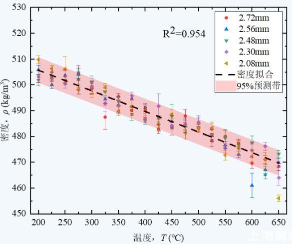 上圖5給出了溫度T在200~650℃范圍內(nèi),使用不同管徑毛細(xì)管測(cè)量的液態(tài)鋰密度實(shí)驗(yàn)值及其擬合曲線。可知,擬合結(jié)果具有良好線性度。各個(gè)溫度點(diǎn)的密度實(shí)驗(yàn)結(jié)果偏差小于±5 kg/m3,相對(duì)誤差為±1%,且實(shí)驗(yàn)結(jié)果均在線性擬合95%預(yù)測(cè)帶中,其中預(yù)測(cè)帶表示對(duì)多次實(shí)驗(yàn)結(jié)果分析,充分考慮實(shí)驗(yàn)偶然誤差,單次實(shí)驗(yàn)結(jié)果在預(yù)測(cè)帶之間,說(shuō)明實(shí)驗(yàn)結(jié)果具有較好可信度。