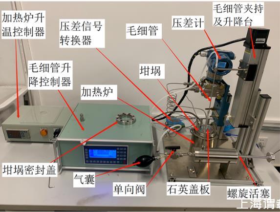 下圖為本文設(shè)計(jì)的測(cè)量裝置原理示意圖與實(shí)物圖,該裝置主要由4個(gè)系統(tǒng)組成:氣路系統(tǒng)、毛細(xì)管升降系統(tǒng)、加熱恒溫系統(tǒng)以及數(shù)據(jù)采集系統(tǒng)。