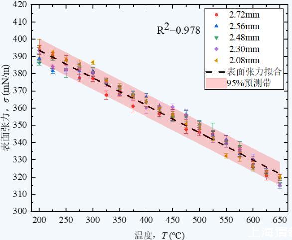上圖6給出了溫度T在200~650℃范圍內(nèi),使用不同管徑毛細(xì)管測(cè)量的液態(tài)鋰表面實(shí)驗(yàn)值及其擬合曲線。可知,擬合結(jié)果具有良好線性度。各個(gè)溫度點(diǎn)的密度實(shí)驗(yàn)結(jié)果偏差小于±5 mN/m,相對(duì)誤差為±1.4%,且實(shí)驗(yàn)結(jié)果均在線性擬合95%預(yù)測(cè)帶中,說(shuō)明實(shí)驗(yàn)結(jié)果具有較好可信度。